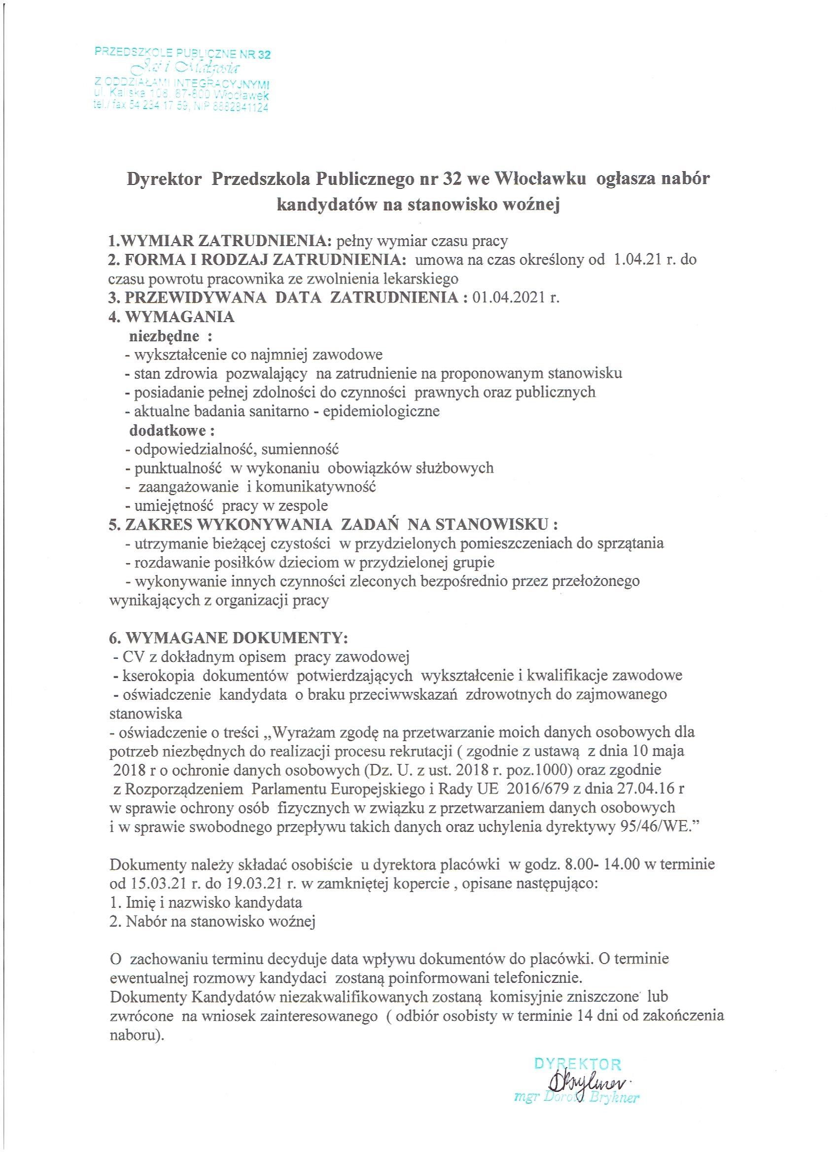 | Ogłoszenie woźna | dodany: 14:12, 15.03.2021 | przez: Monika Suchomska | |